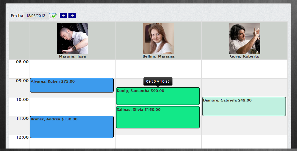 Se obtiene una vista completa del día, organizado por horarios y empleados.